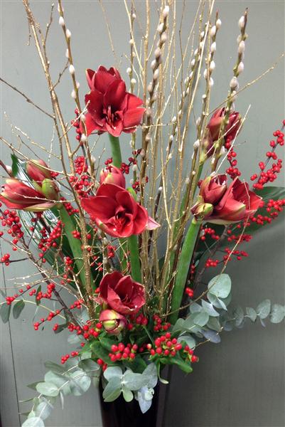 Red amaryllis in a back vase with ilex berries and gold twigs.