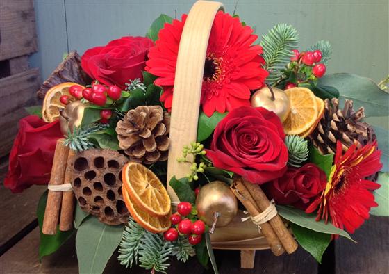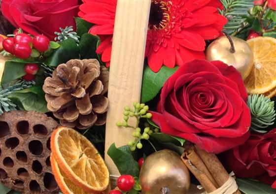 A christmas trug basket arrangement with rich red roses, berries and mixed dried fruits with cones and cinnamon.