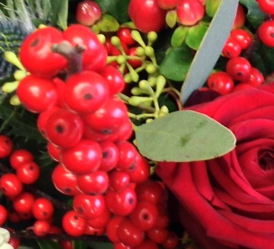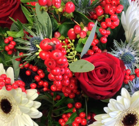 Celebrate Christmas with this wintery look bouquet of warming red roses and berries mixed with contrasting white gerberas and chrysanthemums.