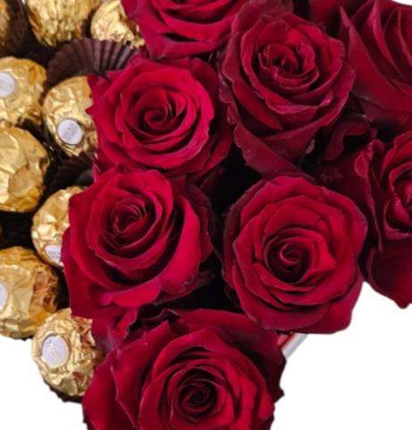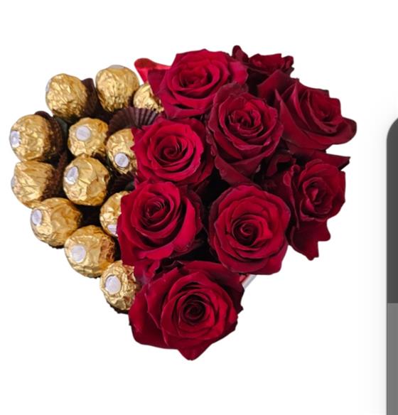 A boxed heart of 9 beautiful explorer roses and a dozen chocolates. ( contain nuts)