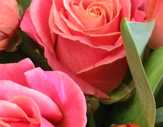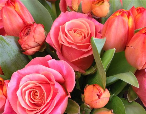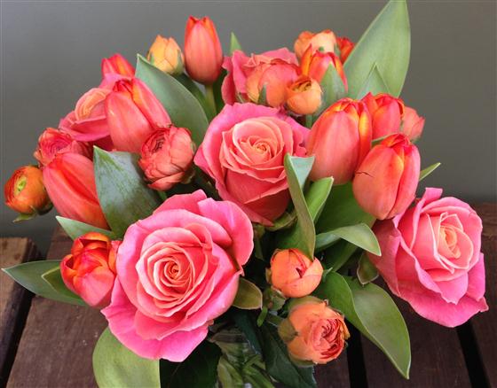 A lively bunch of orange and pink tulips and roses, spring with a twist.